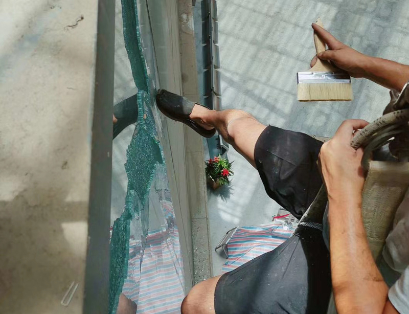 第三步:玻璃運到施工現場后,工人現場乘坐吊籃現場安裝施工。最后施工完成。